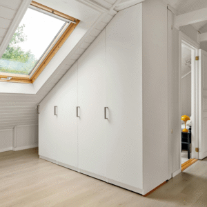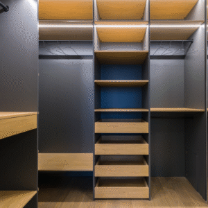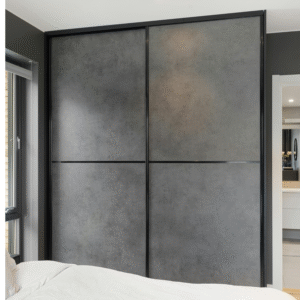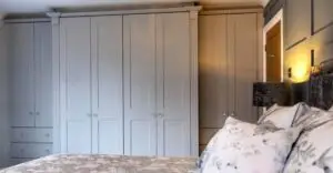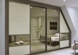 Wardrobe in hallway with mirrored wall reflecting furniture of modern kitchen in light apartment