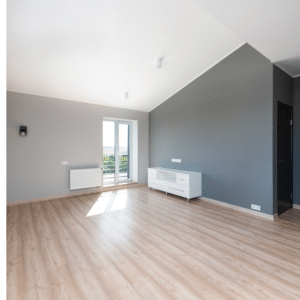 Interior of light apartment with table and couch near TV with cabinet and white walls near window with curtains and stool near lamp